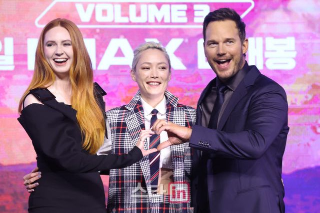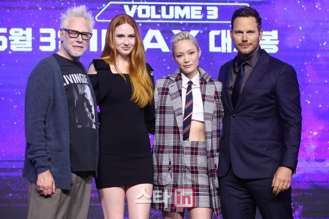 18일 오전 서울 영등포구 콘래드 서울에서는 마블 영화 ‘가디언즈 오브 갤럭시: Volume 3’(이하 ‘가오갤3’, 감독 제임스 건)의 개봉을 앞두고 감독 및 주연 배우들의 내한 기자간담회가 열렸다. 이날 간담회에는 제임스 건 감독을 비롯해 주연 배우 크리스 프랫(피터 퀼/스타로드 역)과 카렌 길런(네뷸라 역), 폼 클레멘티에프(맨티스 역)가 참석해 한국에 방문한 소감 및 ‘가오갤3’의 개봉을 앞둔 소회 등을 털어놨다. ‘가오갤’ 시리즈의 감독 및 배우들이 한국을 찾은 것은 이번이 최초다. 또 이번 작품의 월드 투어 행선지 중 한국을 첫 번째로 택해 눈길을 끌었다.