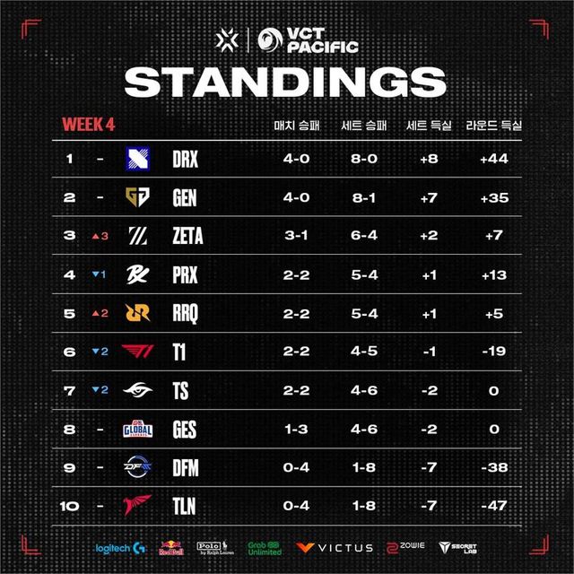 젠지는 4주 차에서 이기면서 4연승을 달렸고 세트 득실 +7로 2위를 지켰다. 압도적인 행보를 보이고 있는 DRX는 말레이시아·싱가포르 팀 페이퍼 렉스(Paper Rex; PRX)와의 경기를 세트 패배 없이 승리하며 4경기 연속 무실 세트 전승 행진을 이어갔다. T1은 젠지에 패배하면서 6위로 떨어졌다.