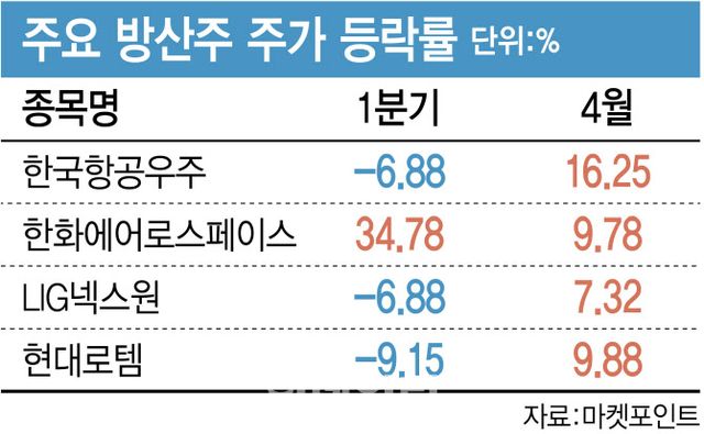 18일 마켓포인트에 따르면 한국항공우주(047810)는 이날 전거래일 대비 2.23%(1200원) 오른 5만5100원에 마감했다. 한화에어로스페이스(012450)는 1%대 하락했으나 LIG넥스원(079550)이 1%대, 현대로템(064350)이 강보합 마감하는 등 방산 테마주가 전반적으로 강세 마감했다. 이같은 흐름은 이달 내내 이어져 한국항공우주는 4월 들어 16.25%, 한화에어로스페이스는 9.78%, LIG넥스원은 7.32%, 현대로템은 9.88% 올랐다. 합병 이슈로 강세를 보였던 한화에어로스페이스를 제외한 방산 테마주가 1분기동안 약세를 보였던 것과는 다른 흐름이다.