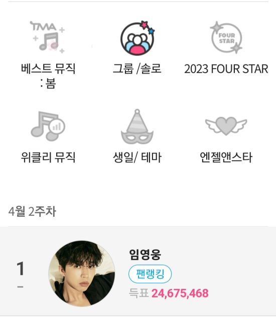 아이돌차트에 따르면, 지난 4월 7일부터 4월 13일까지 집계된 4월 1주 차 평점랭킹에서 임영웅이 41만 9676표를 얻어 최다 득표를 기록했다. 이로써 그는 아이돌차트 평점랭킹에서 무려 107주 연속 1위에 오르게 됐다.