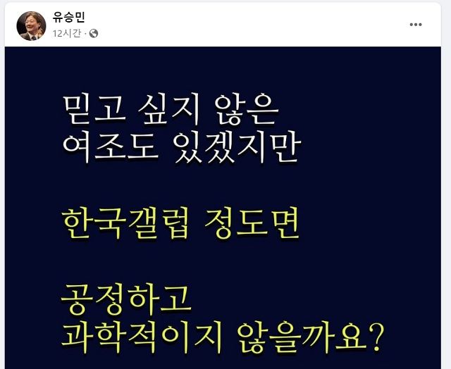 국민의힘 유승민 전 의원이 "믿고 싶지 않은 여조(여론조사)도 있겠지만, 한국갤럽 정도면 공정하고 과학적이지 않을까요?"라는 메시지를 페이스북에 올렸다.