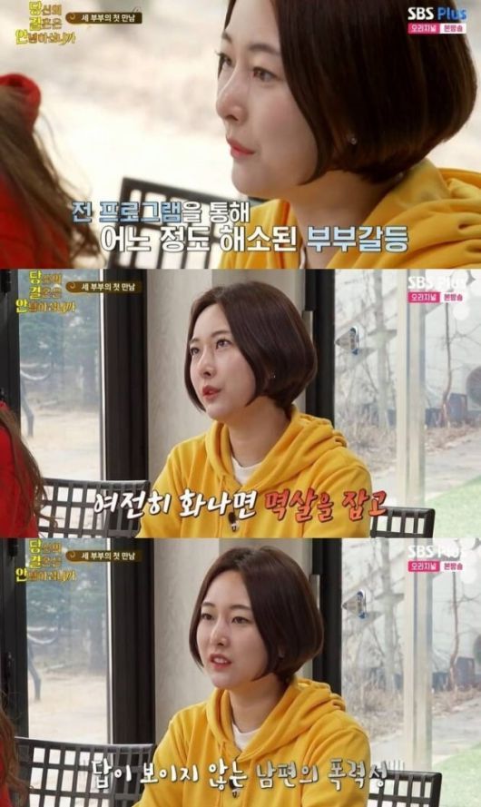 이어 "주변에서 또 나왔냐고 할까봐 걱정했다. '결혼지옥'을 통해 어느 정도 부부갈등은 해소됐다. 확실히 다 드러내니까 후련한 게 있었다. 그런데 그 다음에 화가 났을 때, 또 멱살을 잡으려고 했다. '때릴 거면 때려. 오빠만 손해야' 이렇게 말했다. 경찰이 출동했고 이게 도대체 언제 끝날까 생각이 든다"고 여전한 남편의 폭력성을 폭로했다.