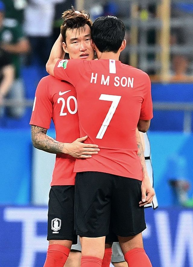2018 러시아 월드컵 F조 2차전 대한민국과 멕시코의 경기에서 1-2로 패한 뒤 눈물을 보인 장현수와 그를 위로하는 손흥민