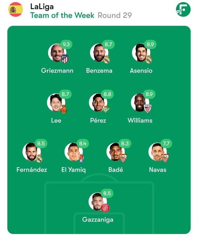 축구통계매체 ‘풋몹’은 이강인을 라리가 29라운드 베스트 일레븐에 넣었다. 평점 순인데 이강인은 8.7점을 받았다. 경기력과 세운 기록을 고려하면 명단에 드는 게 당연했다. 이강인과 함께 앙투완 그리즈만(아틀레티코 마드리드), 카림 벤제마, 마르코 아센시오, 나초 페르난데스(이상 레알 마드리드), 헤수스 나바스, 로익 바데(이상 세비야), 파블로 가사니가(지로나) 등이 이름을 올렸다.