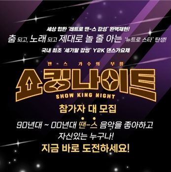 이와 함께 '쇼킹나이트'에서는 내적 댄스 본능과 떼창을 유발했던 Y2K 댄스곡을 완벽 재현할 참가자를 공개 모집한다. 90-00년 노래와 춤을 사랑하는 '댄스 DNA'를 가진 사람이라면 누구나 신청할 수 있으며 그룹 지원도 가능하다. 자세한 내용은 '쇼킹나이트' 공식 홈페이지를 통해 확인할 수 있다.