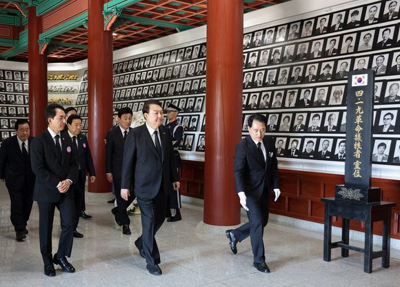 윤 대통령은 19일 국립4‧19민주묘지에서 개최된 제63회 4‧19혁명기념식에서 "4‧19혁명 정신은 대한민국 헌법 정신이 됐다"며 "정부는 어느 한 사람의 자유도 소홀히 취급되어서는 안 된다는 4‧19혁명정신이 국정 운영뿐 아니라 국민의 삶에도 깊이 스며들게 하겠다"고 말했다.