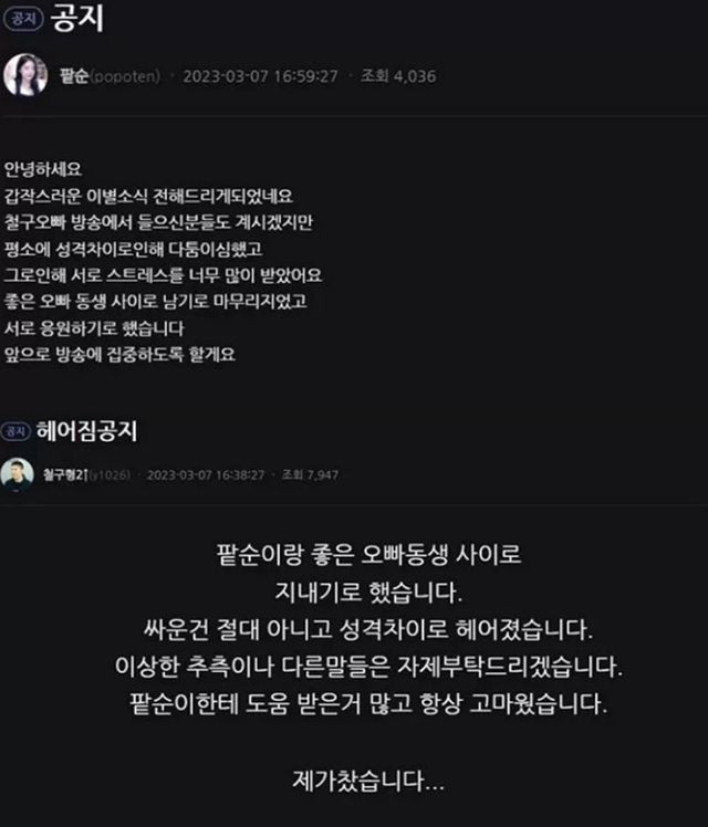 BJ 팥순, 철구가 각각 올린 공지문