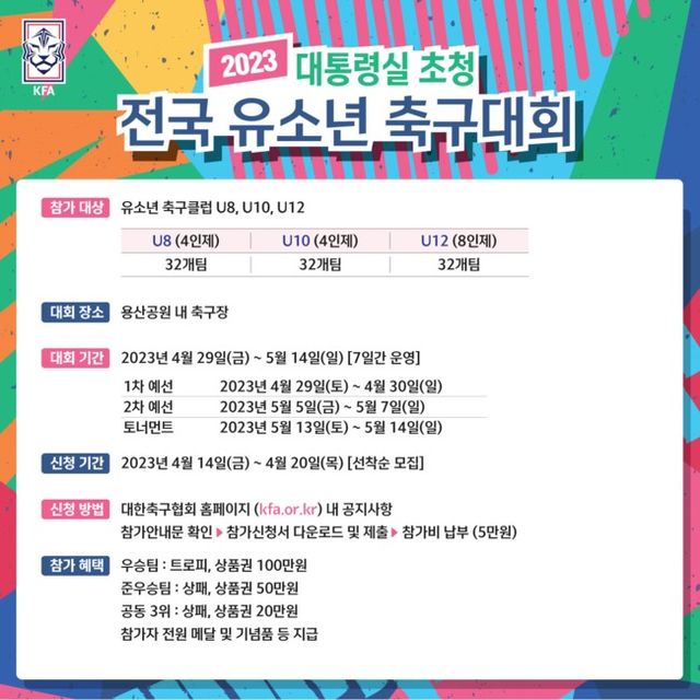 대회 참가 신청은 선착순으로 진행되며, 보다 자세한 사항은 대한축구협회 홈페이지(www.kfa.or.kr) 내 공지사항에서 확인이 가능하다.