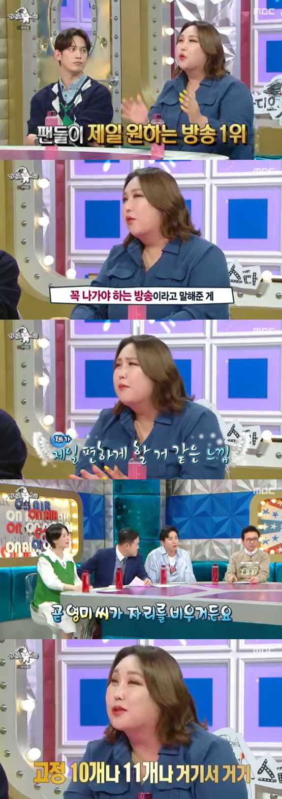 김구라는 "'라스' 출연에 큰 의미가 있다던데?"라고 물었고, 풍자는 "팬들이 제일 원하는 프로그램이다. 5년 전부터 꼭 나가야하는 프로그램이라고 말씀을 해주셨다. 아무래도 제일 편안하게 할 수 있지 않을까 생각을 하시더라. 어제도 라이브를 했는데 그 때도 '라스' 얘기를 하셨다. 입이 근질근질했다"면서 웃었다.