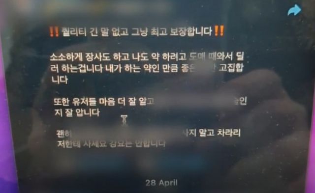 지난해 4월 학생들이 텔레그램에 올린 광고글을 보면 "퀄리티 긴말 없고 최고 보장한다" "소소하게 장사도 하고 나도 약 하려고 도매를 떼왔다" "내가 하는 약인 만큼 좋은 것만 고집한다" "어떤 약이 좋은 약인지 잘 안다" "괜히 (약을) 해보지도 않은 XX한테 사지 말고 차라리 저한테 사라" 등의 말로 홍보했다. 마약을 뜻하는 은어를 사용하기도 했다.