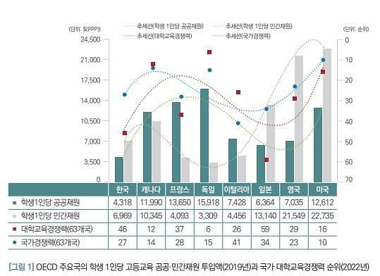 そのため、主要国のうち下位圏である韓国の大学教育競争力を引き上げるために、政府の財政投入をさらに増やさなければならないという指摘が出た。
