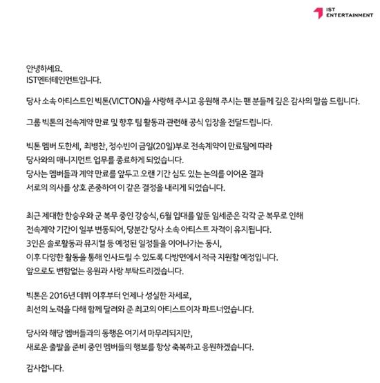 소속사 IST엔터테인먼트는 20일 "빅톤 멤버 도한세, 최병찬, 정수빈이 전속계약이 만료됨에 따라 당사 매니지먼트 업무를 종료하게 되었다"라고 밝혔다.