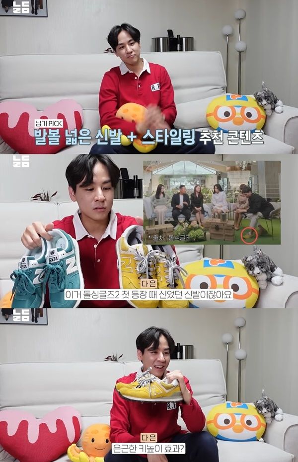 여러 가지 운동화를 소개하던 중 '돌싱글즈2' 출연 당시 착용했던 신발을 들고 "굽이 높다. 대놓고 키높이 효과가 있다. 언제나 구할 수 있는 신발이다. 춘천 카페 갔을 때 신었던 신발"이라고 회상했다.