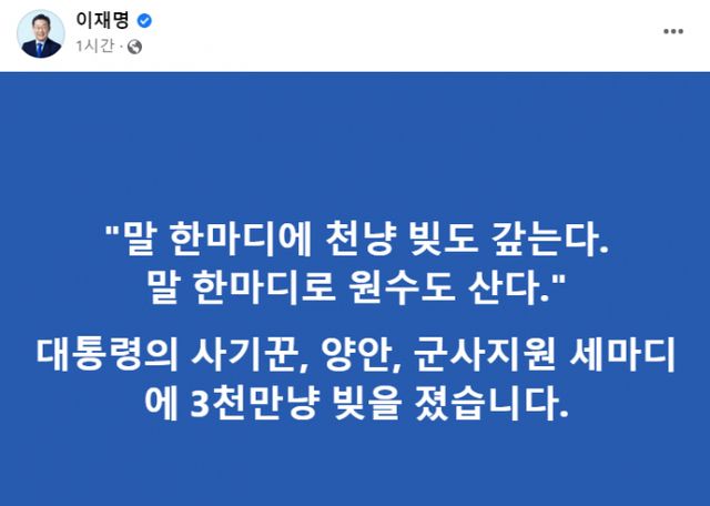 이 대표는 20일 자신의 페이스북을 통해 "말 한마디에 천냥 빚도 갚고 말 한마디로 원수도 산다"며 이같이 밝혔다. 이 대표의 발언은 지난 19일 윤 대통령의 4·19 혁명 기념사와 중국·타이완(양안), 러시아·우크라이나 전쟁 관련 발언을 겨냥한 것으로 분석된다.