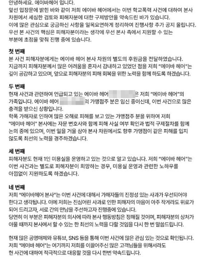 다만 학교폭력 가해자로 인해 피해를 본 가맹점은 법적으로 보호할 방침이다. 에이바 헤어는 "가맹점주분이 현재 임신 중이다. 그런데 이번 사건으로 큰 충격을 받으신 상황이다. 학폭 가해자로 인해 많은 오해와 피해를 당하고 있는 가맹점주를 위해 자문 변호사와 함께 사실 여부 확인과 법적 구제 절차를 논의하고 있다"고 전했다.
