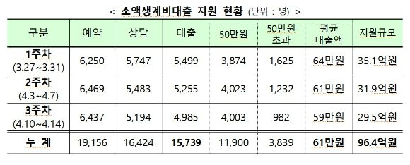50만원을 대출받은 사람은 1만1천900명, 병원비 등 자금용처 증빙을 통해 50만원을 초과해 대출받은 사람은 3천839명으로 1인당 평균 대출금액은 61만원 수준이다.