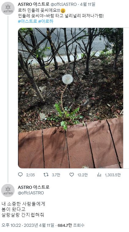 "로하 민들레 꽃씨예요!!! 민들레 꽃씨야~ 바람 타고 널리널리 퍼져나가렴! 내 소중한 사람들에게 봄이 왔다고 살랑살랑 간지럽혀줘."