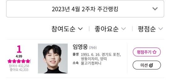 아이돌차트에 따르면, 지난 4월 14일부터 4월 20일까지 집계된 4월 2주 차 평점랭킹에서 임영웅은 43만 2258표를 얻어 최다 득표를 기록했다.