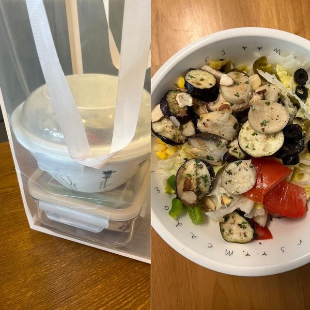 환경을 위한 하루의 점심은 고기가 들어가지 않은 구운가지 버섯 샐러드와 함께하기로 했다. 집에서 사용하던 밀폐용기를 들고 매장에 찾아가 기존의 일회용 포장 용기 대신 개인 용기에 담아줄 수 있는지 묻자 너무나 흔쾌히 수락해 주셨다. (사진의플라스틱 백을 보고 환경을 위한 하루에 웬 플라스틱인가 하는 생각이 들 수 있겠다 싶어 덧붙이자면, 이는집에 있던 것을 재 사용한 것이다.) 제로웨이스트를 실천하는 데 있어 플라스틱을 사용하지 않는 것이 가장좋지만, 의도치 않게 플라스틱을 사용하게 됐다면 위생에 문제가 되지 않는 선에서 최대한 가지고 있는것들을 활용해 보자.