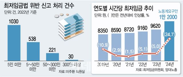 저임금근로자와 소상공인 간의 최저임금 갈등은 해마다 치열해지고 있다. 고용노동부에 따르면 지난해 사업주가 최저임금법을 위반했다며 근로자가 고용부에 신고한 건수가 1631건에 달하는 것으로 나타났다. 이 중 5인 미만 사업장 근로자가 신고한 건수가 917건으로 전체의 56%를 차지했다.