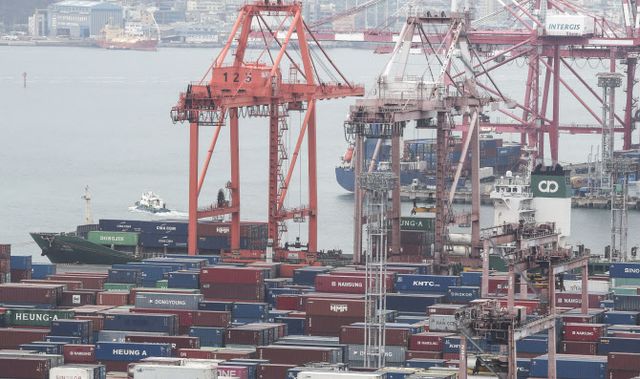 21일 부산항 신선대부두에서 컨테이너 하역작업이 진행되고 있다.(사진=연합뉴스)
