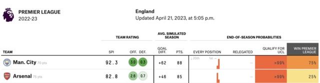 우승도 점점 멀어지고 있다. 데이터 분석 업체 ‘파이브서티에잇’에 따르면 아스널의 우승 확률은 단 25%에 불과하다. 아직 1위를 지키고 있지만, 최근 맹렬한 기세의 맨시티가 2경기를 덜 치르고도 승점차가 5점에 불과하기 때문에 업체는 맨시티에 75%의 우승 확률을 부여했다.