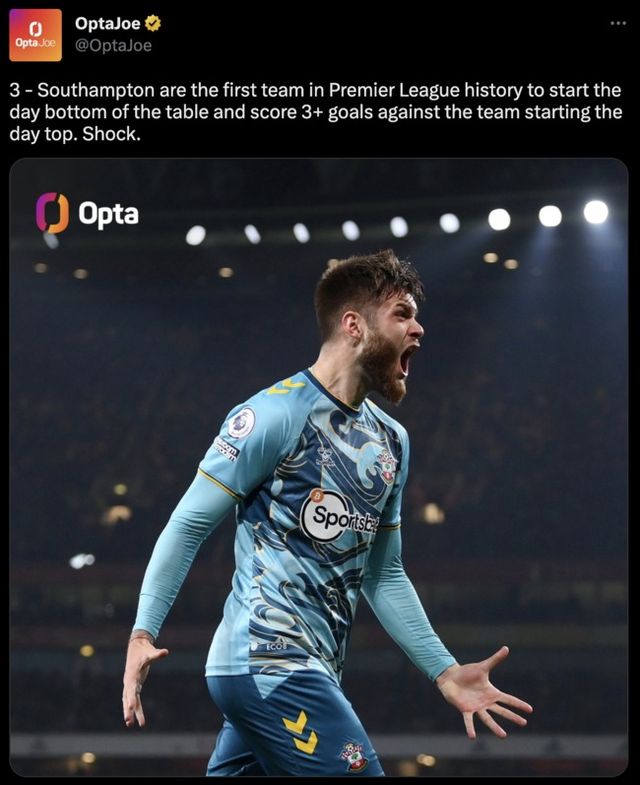 굴욕적인 기록도 작성했다. 축구 통계 매체 ‘옵타’에 따르면, 아스널은 EPL 30년 역사상 리그 20위 팀에 3실점을 내준 최초의 리그 1위 팀이 됐다. 만약 후반 막판 맹렬한 추격이 없었다면 이 기록에 ‘패배한’이라는 실망스러운 문구까지 추가될 뻔했다.