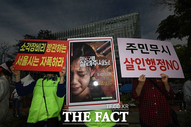 마포 소각장 추가 백지화투쟁본부는 이날 마포구청 앞 도로에서 소각장 추가 신설 전면 철회를 요구하는 집회를 열었다.