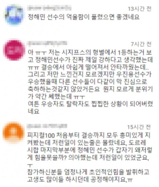 앞서 ‘피지컬: 100’ 결승전이 공개된 후, 누리꾼들 사이에서 무한 로프 당기기 경기에서 선수들이 당긴 로프의 장력이 선수마다 달랐다는 의혹이 제기됐다. 해당 의혹을 처음 주장한 누리꾼은 정해민이 2위를 차지하고서도 인스타그램에 ‘피지컬: 100’과 관련한 글을 한 개도 올리지 않았고, 우진용도 출연진들과 함께 찍은 사진을 올리며 정해민만 태그하지 않았다는 것이 근거라고 언급했다. 이에 결승전에서 재경기를 진행한 게 아니냐는 의혹도 거세졌다.
