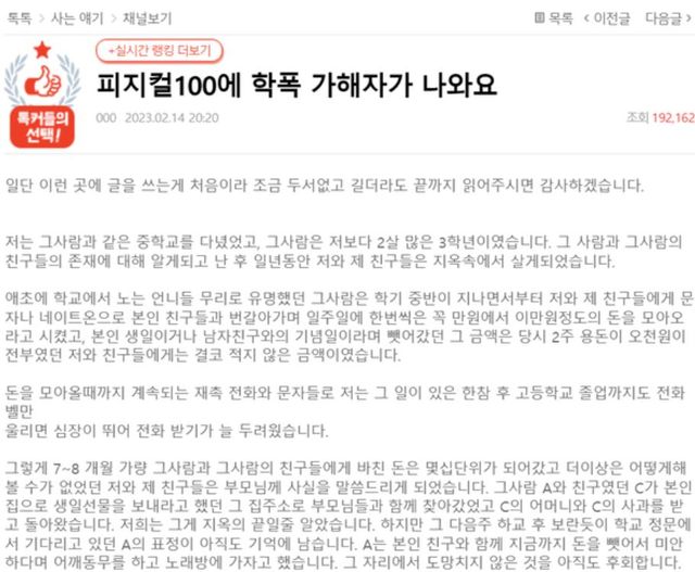 B씨는 "더 이상 어떻게 해볼 수가 없어서 부모님께 사실을 말씀드리게 됐고, A의 친구 집으로 찾아가 그 친구와 어머니에게 사과받았다. 그게 지옥의 끝일 줄 알았지만 다음 주 하교 후 보란 듯이 A는 정문에서 기다리고 있었고 '돈을 뺏어서 미안하다'며 어깨동무하고 노래방에 끌고 갔다. 무릎을 꿇은 제게 A는 다리를 꼰 채 머리채를 잡아 뺨을 몇 대씩 휘갈겼고 그제야 분이 풀렸는지 폭력을 멈추고 제 핸드폰으로 제 친구들에게 연락해 늦은 밤 공원으로 불러냈다. 친구 두 명은 같은 방식으로 두들겨 맞았다"고 밝혔다.