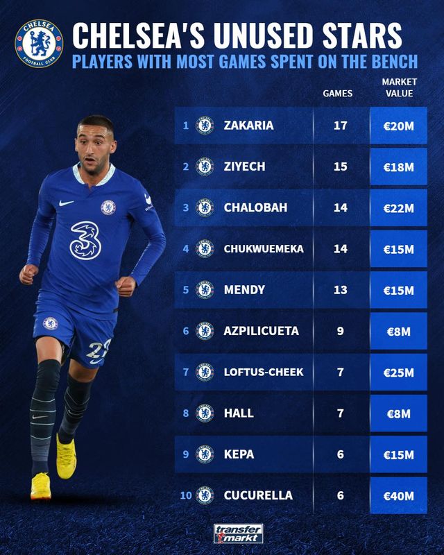 첼시에서 가장 많이 벤치를 지킨 10명의 몸값을 모두 더하면 총 1억 8600만유로(약 2722억원)에 달했다.