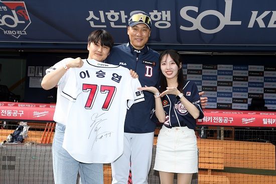 이 감독은 22일 KT 위즈와의 잠실 홈 경기에 앞서 두산 팬 진병현-김재윤 씨 커플과 뜻깊은 시간을 가졌다. 두 사람에 친필 사인이 담긴 자신의 유니폼을 선물하고 지난 1일 홈 개막전 승리구를 전달해 준 마음에 고마움을 표했다.
