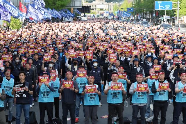 本月19日,全国金属劳动组合成员在首尔世宗大路一带举行集会,谴责尹锡悦政府的劳动时间改革方案。【图片提供 韩联社】