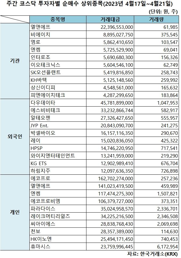 [표] 주간 코스닥 기관·외인·개인 순매수 상위종목(4월17일~4월21일)