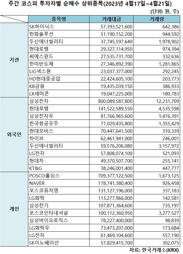 [표] 주간 코스피 기관·외인·개인 순매수 상위종목(4월17일~4월21일)