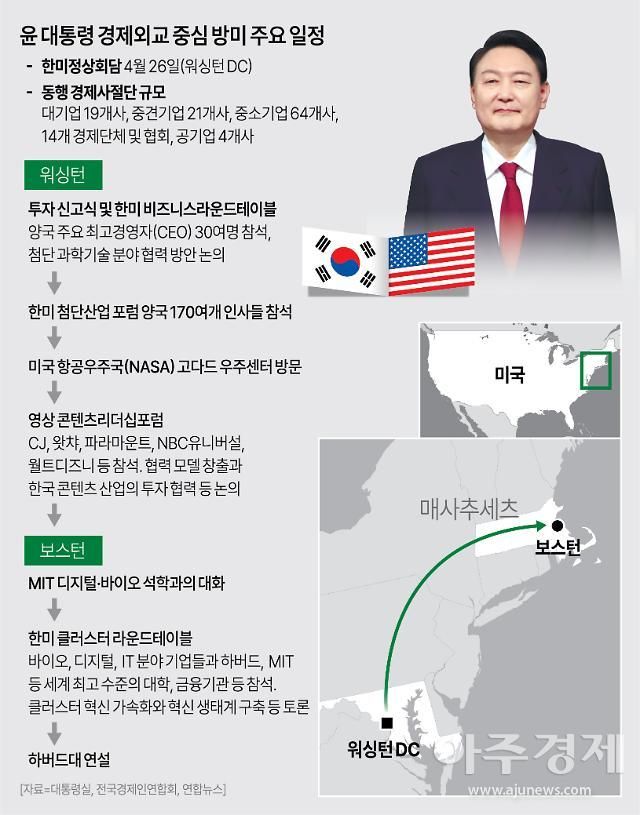 Mặt khác, lãnh đạo của tổng số 122 công ty cũng sẽ tháp tùng tổng thống Yoon trong chuyến thăm cấp nhà nước tới Mỹ. Con số này bao gồm 19 tập đoàn lớn, 21 công ty vừa, 64 doanh nghiệp vừa và nhỏ, cũng như 14 tổ chức kinh tế và hiệp hội, và 4 doanh nghiệp nhà nước, tiêu biểu có lãnh đạo của bốn tập đoàn lớn, bao gồm Chủ tịch Lee Jae-yong của Samsung Electronics, Chủ tịch Chey Tae-won của SK Group, Chủ tịch Chung Eui-sun của Hyundai Motor và Chủ tịch Koo Kwang-mo của LG Group cùng với đại diện 6 tổ chức kinh tế lớn bao gồm Liên đoàn Công nghiệp Hàn Quốc, Phòng Thương mại và Công nghiệp Hàn Quốc, Liên đoàn Doanh nghiệp Hàn Quốc và Hiệp hội Thương mại Quốc tế Hàn Quốc.