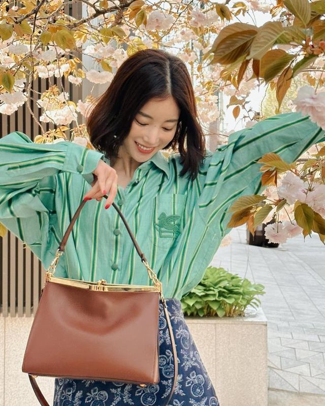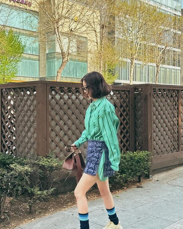 기은세. 여기에 과일 패턴이 귀여운 미니스커트를 매치하여 패턴 플레이 룩을 즐겼습니다. 블루와 그린의 컬러 조합까지 싱그러운 초여름 그 자체네요!