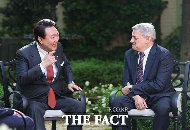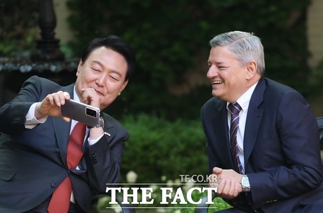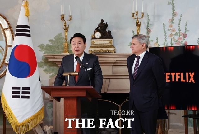 [더팩트ㅣ허주열 기자] 윤석열 대통령이 미국 국빈 방문 첫날(24일, 현지시간) 오후 첫 일정으로 워싱턴DC 소재 영빈관인 블레어하우스에서 세계 최대 온라인 동영상 스트리밍업체 넷플릭스 최고경영진을 접견, 세일즈 외교에 나섰다. 이 자리에서 테드 서랜도스 넷플릭스 공동 CEO는 향후 4년 동안 25억 달러(약 3조3000억 원)를 K-콘텐츠에 투자하겠다고 밝혔다.