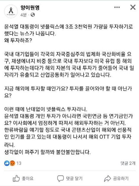 양이 의원은 이어 “한류 바람을 얘기할 정도로 국내 콘텐츠산업이 해외에 선풍적인 인기를 끌고 있는데 대통령이 나서 해외 온라인동영상서비스(OTT) 기업 투자를 한다고 한다”며 “생각 없이 퍼주기를 할까 봐 불안 불안하다”고 썼다.