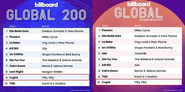 [뉴스컬처 김기주 기자] 그룹 FIFTY FIFTY(피프티 피프티)의 'Cupid’가 빌보드 ‘글로벌 200’ TOP 10에 진입하며 기록을 세웠다.