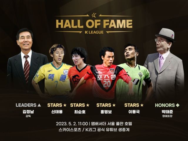 'K리그 명예의전당'은 한국프로축구연맹(총재 권오갑)이 K리그 출범 40주년을 기념해 올해 신설했다. 'K리그 명예의전당'은 선수, 지도자, 공헌자 3개 부문으로 구성되고, 올해를 시작으로 향후 매 2년마다 헌액자를 선정한다. 초대 헌액자로는 선수 부문에 최순호, 홍명보, 신태용, 이동국, 지도자 부문에 김정남 전 울산현대 감독, 공헌자 부문에 故 박태준 포스코 명예회장이 이름을 올렸다.