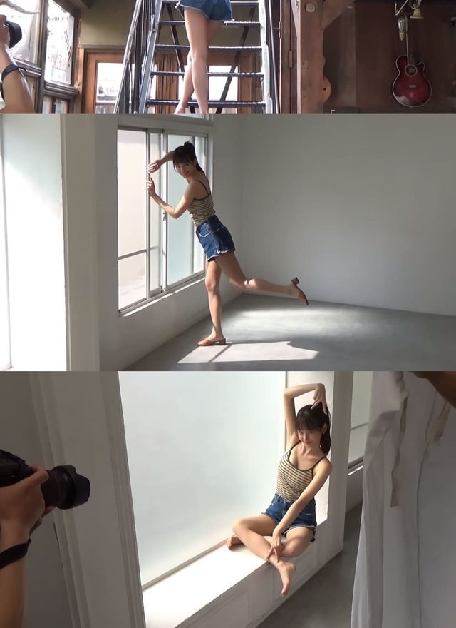 자연광 아래서 화장기 없이 수수한 모습으로 촬영하는 그의 모습은 일본에서 활동한 지 오래된 것처럼 보인다.