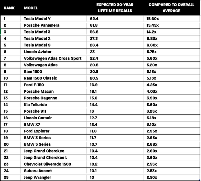 이 4대 중 테슬라 모델 Y는 30년 동안 예상 리콜이 62.4회로 가장 높았고, Model 3 는 30년 동안 예상 리콜이 56.8회로 3위, Model X가 27.3회로 4위, Model S는 26.4개의 예상 리콜로 5위를 차지했다.