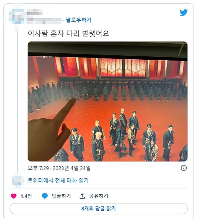한 치 오차도 없는 칼군무를 마친 세븐틴 멤버들과 댄서들이 엔딩 포즈를 짓는 장면을 유심히 본 한 네티즌은 수많은 댄서 중 1명만 다리를 벌리고 있는 것을 목격했고, 손가락으로 해당 댄서를 짚으며 "이 사람 혼자 다리를 벌렸다"고 트위터에 올렸다.