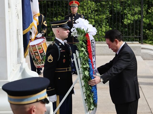 미국을 국빈 방문한 윤석열 대통령이 25일 오전(현지시간) 워싱턴DC 인근 알링턴 국립묘지를 참배하며 무명용사탑에 헌화하고 있다. [사진=연합뉴스]