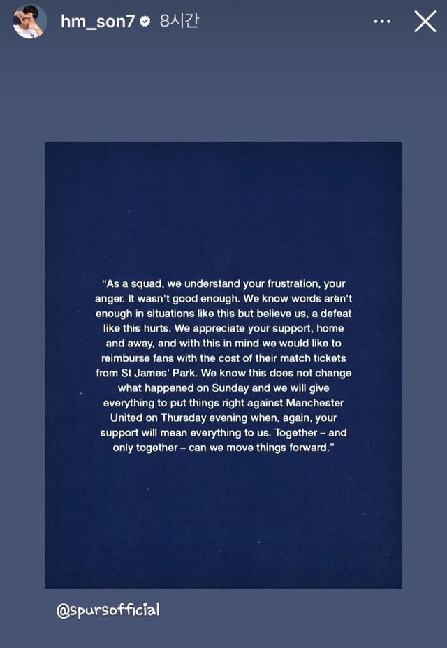 [인터풋볼] 신동훈 기자 = 손흥민도 토트넘 훗스퍼 팬들에게 사과를 전했다.