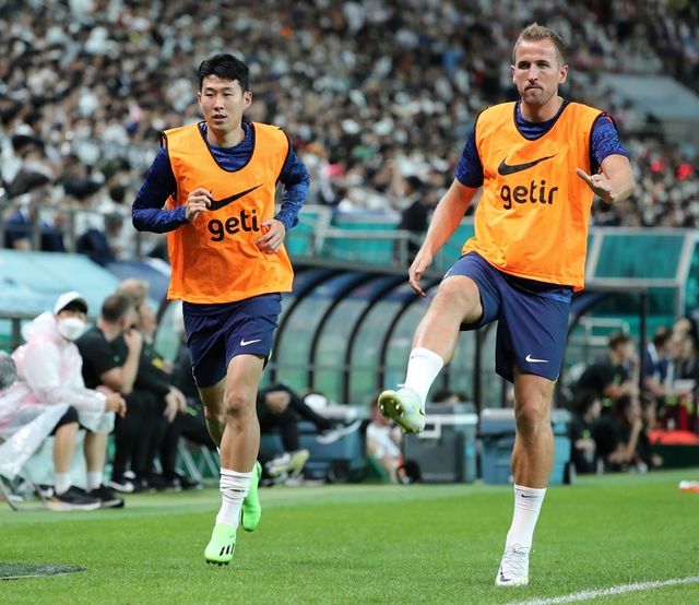 손흥민과 해리 케인이 지난해 7월 13일에 서울 마포구 상암동 서울월드컵경기장에서 열린 쿠팡플레이 시리즈 팀 K리그와의 경기에서 전반 워밍업을 하고 있다. / 뉴스1
