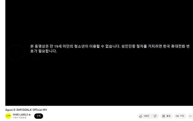 방탄소년단(BTS) 멤버 슈가의 신곡 'AMYGDALA'(아미그달라) 뮤직비디오가 '19금' 판정을 받았다.
