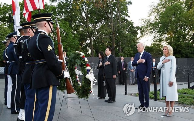 윤 대통령이 25일(현지 시각) 저녁 바이든 대통령과 함께 미국 워싱턴DC에 있는 '한국전 참전용사 기념비'를 방문해 헌화했다.