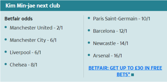 영국 베팅 사이트 벳페어는 '김민재의 다음 구단'을 주제로 배당률을 공개했는데 수개월 전부터 그의 영입을 추진한 것으로 알려진 맨체스터 유나이티드가 2대1로 가장 낮은 배당률을 걸었다. 배당률이 낮기 때문에 이적 확률이 가장 높다는 얘기다.